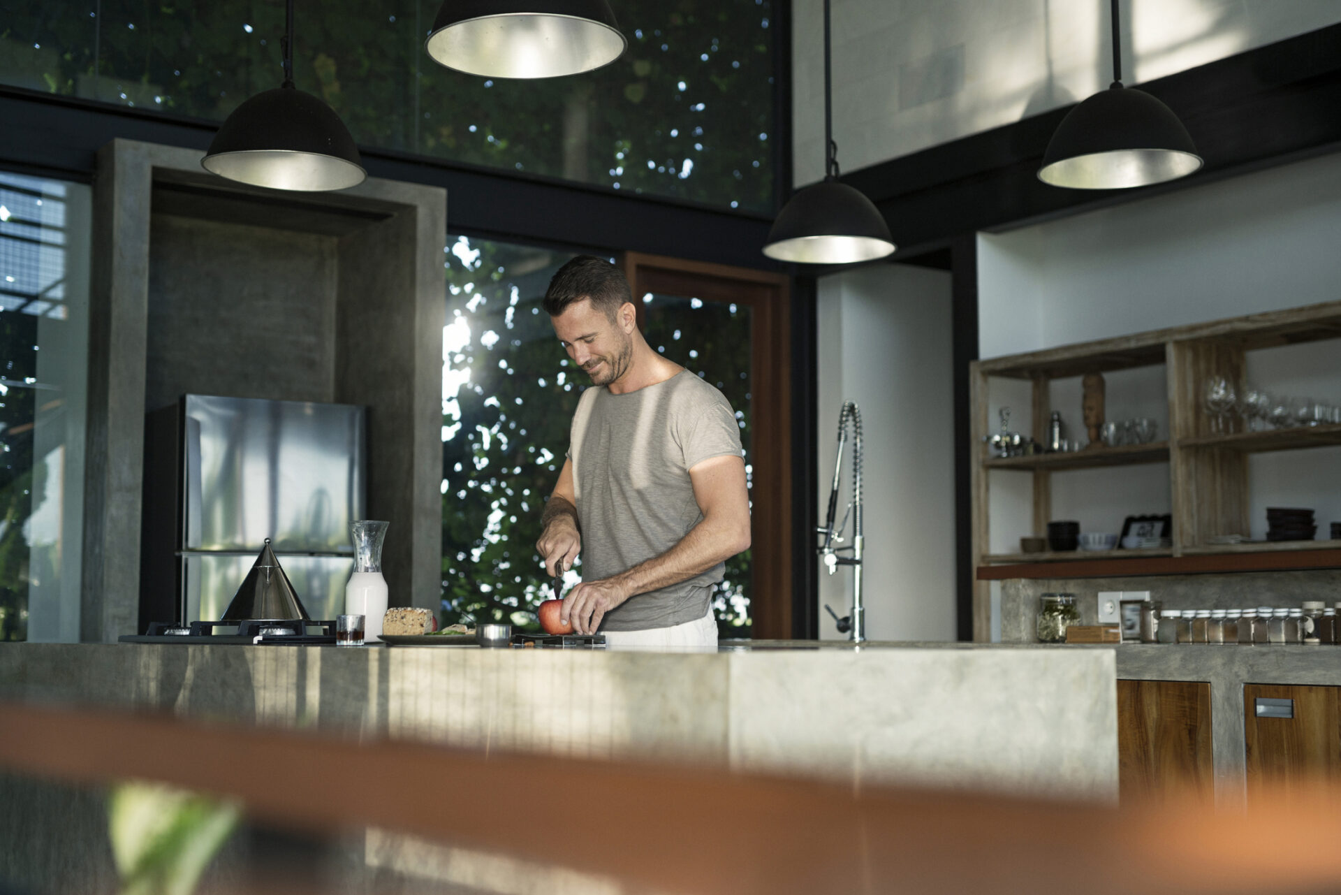 A férfias lakásoknál sokszor előny a nyitott tér: egy légtérben a nappali, konyha és étkező. Ez nemcsak tágasabbá teszi a teret, de társasági élethez vagy otthoni munkához is praktikus megoldás.