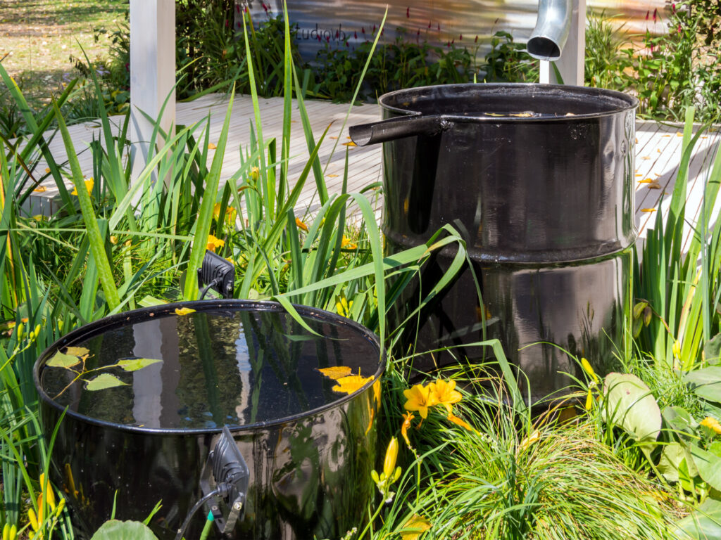 A víz egyre értékesebb erőforrás, így a fenntartható kert egyik alappillére az okos vízhasználat. Már a tervezésnél érdemes számolni esővízgyűjtő rendszerrel, amely összegyűjti a tetőről lefolyó vizet, amit később öntözésre használhatunk.