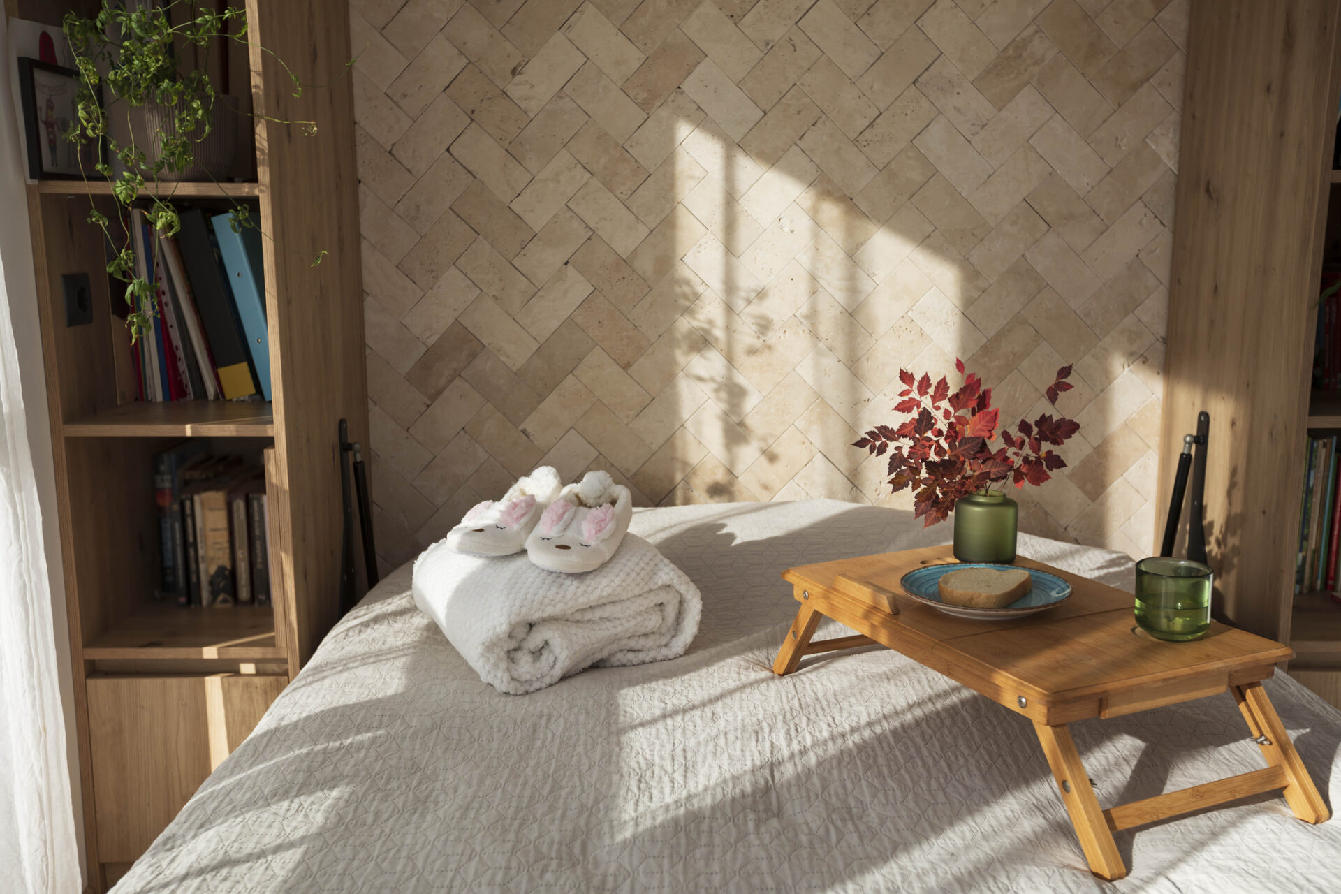 Egy jól megválasztott travertinfelület csendesen dolgozik a háttérben: nem hivalkodó, mégis meghatározza az egész lakás hangulatát.